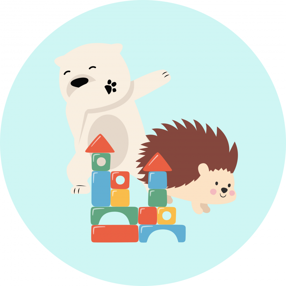 Young polar bear and hedgehog are behind a multicolored block tower. Polar bear is dabbing. Background is light blue